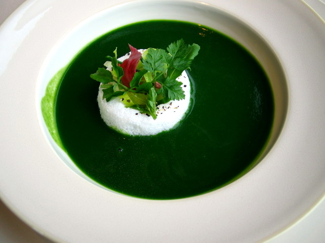 ・ハーブと野菜のなめらかなヴルーテ、新芽野菜とウフ・ア・ラ・ネージュ