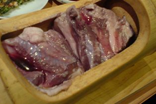 竹の筒の中に、大きなお肉の塊がドンッと出てきて、店員さんが焼いては切って、焼いては切って・・を繰り返していきます。