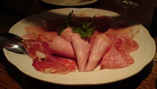 一口サイズの可愛いフォカッチャ、生ハム、カルパッチョ、きのこのソテー、ズッキーニとトマト。