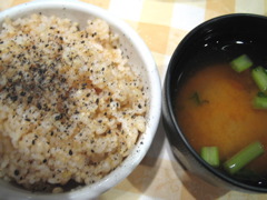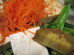 私たちは、豆腐のサラダや、青菜のおひたし(写真なし)、芋の煮っころがし、牡蠣鍋、玄米ご飯にお味噌汁などを食べました。