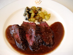 料理は、・牛はらみ肉のポワレ、赤ワインソースで ジャガイモとキノコのソテーを添えて