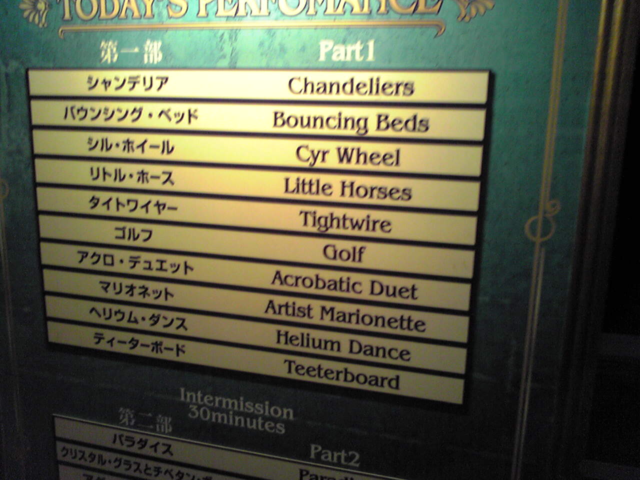 後半細かい内容はネタばれしてしまうのでおいといて、全体的には、幻想的な世界の中で次々に繰り広げられる演目は、まるで技のメリーゴーランドのようでした。そして技もさることながら、出演者のキャラクター、衣装、舞台演出など、どれも非常に魅力的で、「コルテオ」の世界を存分に楽しめました