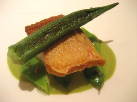 /沼津魚市場より直送された鯛、オクラのソースお魚ほくほく。