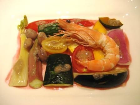 /天使の海老と約13種類の旬の有機野菜のモザイク、フランボワーズドレッシングこれまでいろんな前菜をいただきましたが、こんなに色合いが強い前菜は初めて。