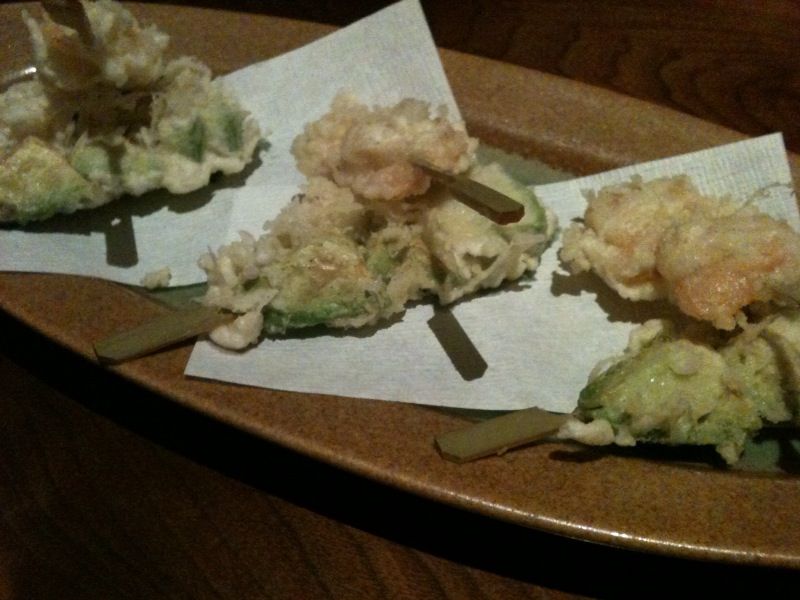 写真にあるのは、アボガドとエビの天ぷら。お塩で頂きます