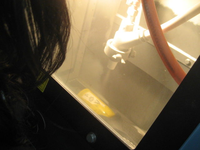 全部くり抜いたら、細かい砂を吹き付ける専用の機械の中にグラスを入れ、まんべんなく砂を吹き付けます。この機械に入れている時間は、ほんの数分程度。