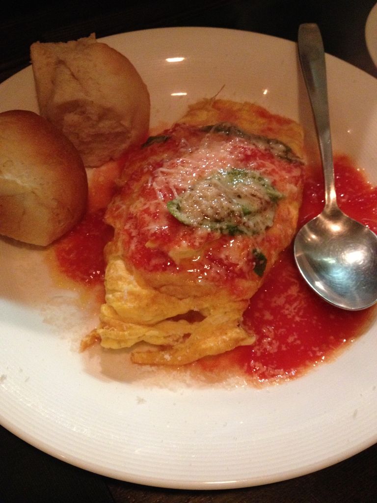 ルッコラと生ハムのサラダ、ゴルゴンゾーラのオムレツ、本日のお肉としてイベリコ豚、パスタには小エビとズッキーニのパスタをいただきました