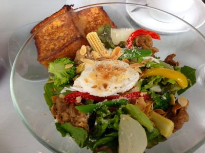 これは友達が頼んだ「6種の野菜とスパイシーチキングリルのサラダ ポーチドエッグ添え パルメザンドレッシング」2品(トースト別でも3品)で