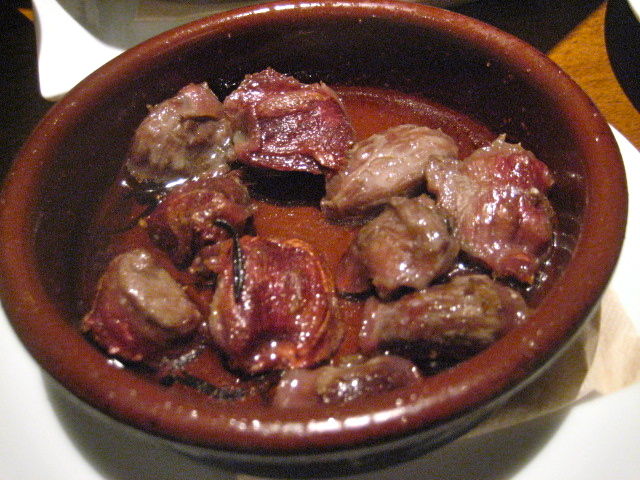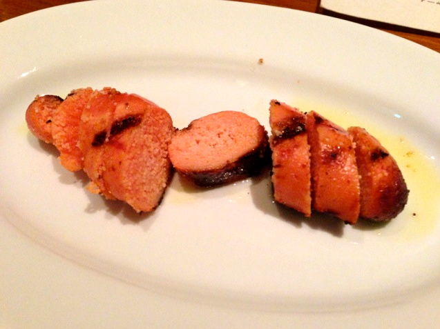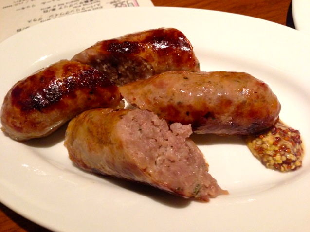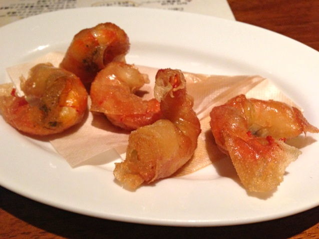スモーク明太子グリル、自家製ソーセージ、海老の包み揚げ、えーと4番目は何だろう(もしかしたらこれは小皿料理じゃないかも?)、あと砂肝のオイル焼きです。(みんなが適当に頼んでいるので、メニュー名がいまいち不明です)