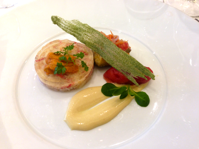 蟹とウニのちょっと甘みのある味わいと、アヴォカドマリネの酸っぱさと、トマトシャーベットの濃厚トマト味がそれぞれ違う味わいを楽しめてグッド