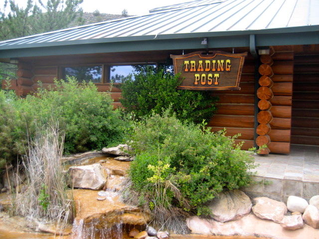 ロッジ風のレストランで、ザイオンの岩々が駐車場から見えます。