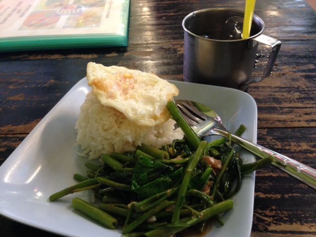 私は空芯菜の炒め物、目玉焼き付きをいただきました。味は至って普通(笑)ですが、値段が屋台並みなので悪くない