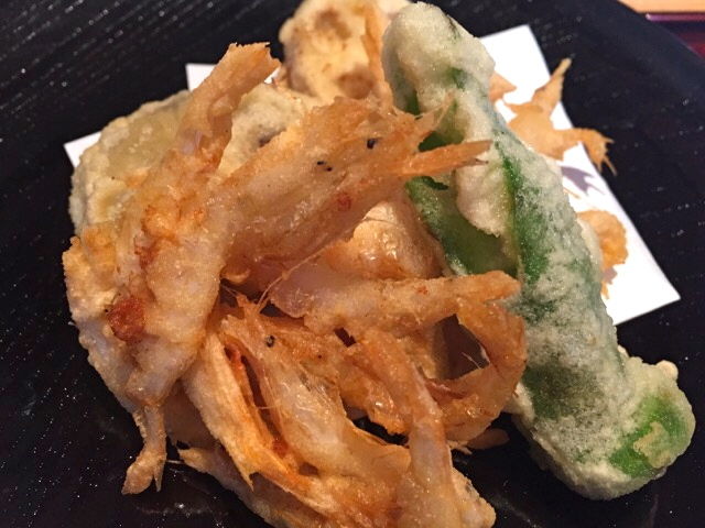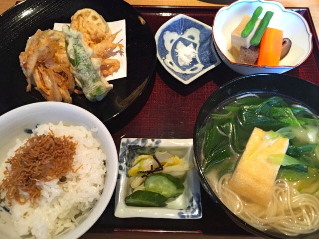 この日の日替わりは「白海老と野菜の天ぷら 京揚げと青葱のにゅう麺」で