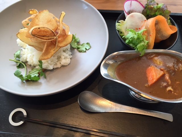 カレーの具材はその季節ごとに変わるようです。レンコンなどを揚げてチップスにしたものがトッピングされています。目にも鮮やかなお食事。たまにはゆったりとした雰囲気で食事をするのもいいなと改めて感じました
